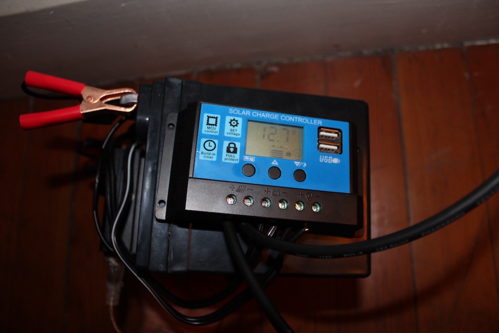 Step 3 Assemble the solar controller, inverter and battery into a tighter package. Re-clamp the wire from the panel to the solar controller and close the window. It should look as above. The charge begins!