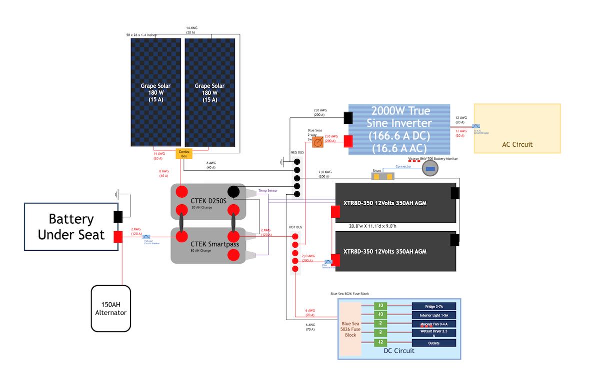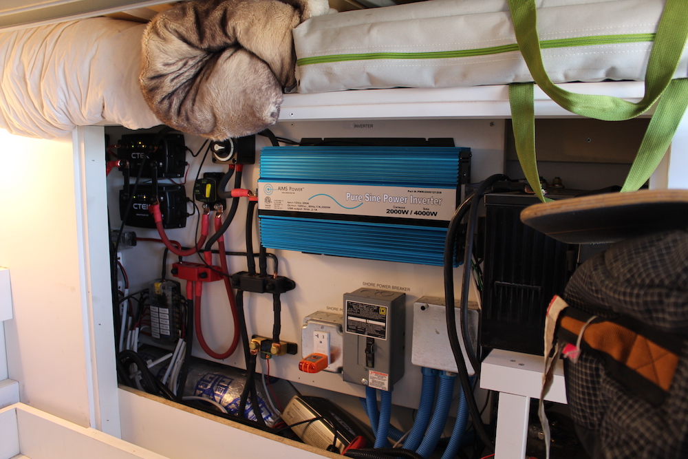 The power requirements of the bus are more significant: a TV, internet connectivity, numerous devices, lights, and an air conditioner. So a 2000W pure sine inverter was the way to go.